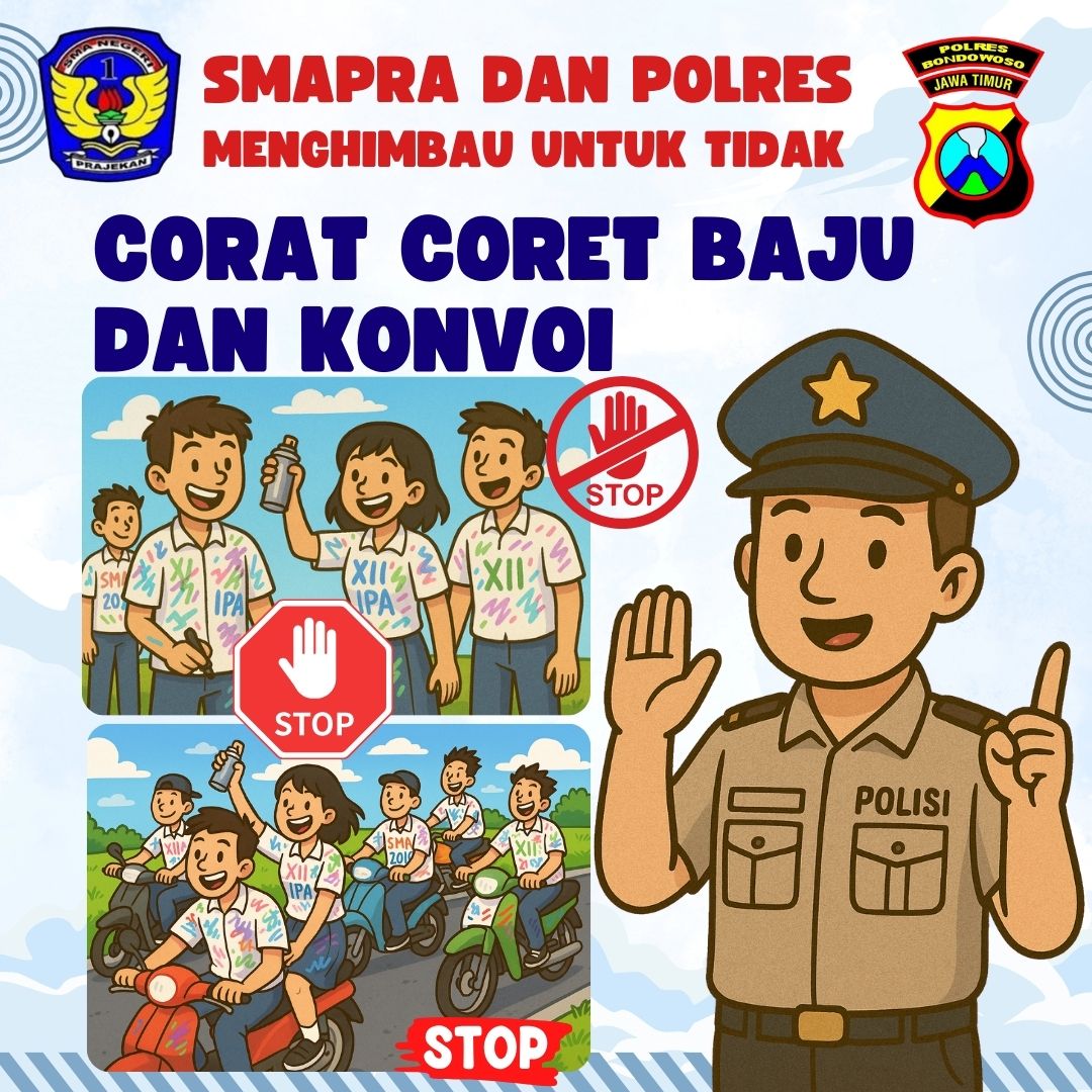 Prajekan – Momen kelulusan memang jadi salah satu saat paling ditunggu siswa kelas XII. Setelah perjuangan panjang selama tiga tahun, wajar dong kalau pengin merayakan! Tapi, SMAN 1 Prajekan (SMAPRA) bersama Polres Bondowoso punya pesan penting buat kalian semua: rayakan kelulusan dengan cara yang positif dan tetap bertanggung jawab, ya! Melalui himbauan bersama ini, pihak sekolah dan kepolisian mengingatkan siswa untuk menghindari aksi konvoi berlebihan,...